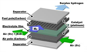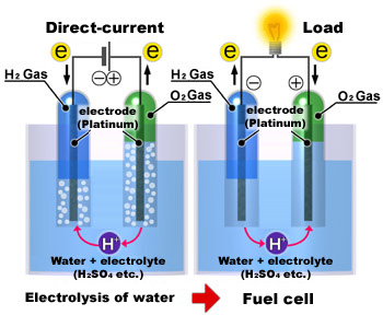 A fuel cell consists of an electrolyte between two electrodes, and a conducting wire linking the two electrodes. Hydrogen fed to one electrode (fuel electrode) divides into hydrogen ions and electrons on the electrode. Hydrogen ions flow through the electrolyte to the other electrode, to which air is fed (air electrode). Electrons flow from the fuel electrode to the air electrode through the conducting wire linking the two electrodes. At this time, the electrical current flows in the opposite direction. At the air electrode, the hydrogen ions react with the oxygen and electrons to produce water and heat.
